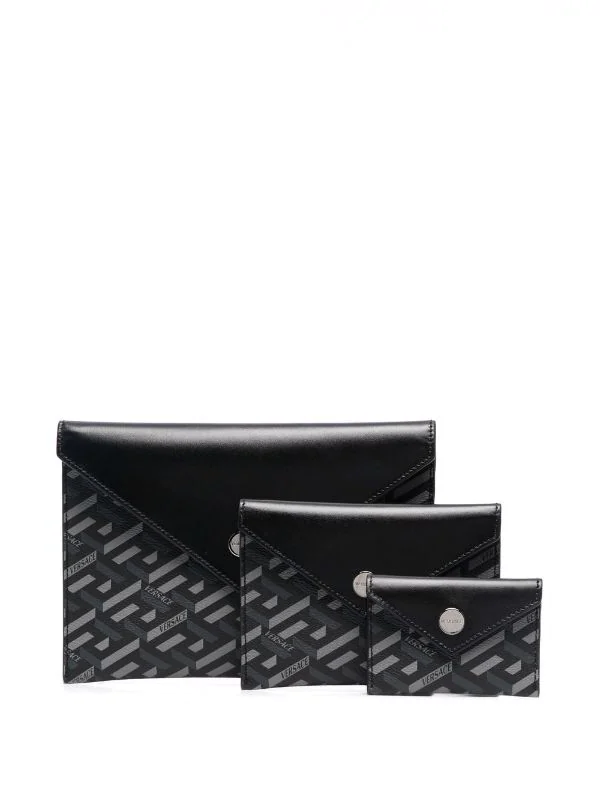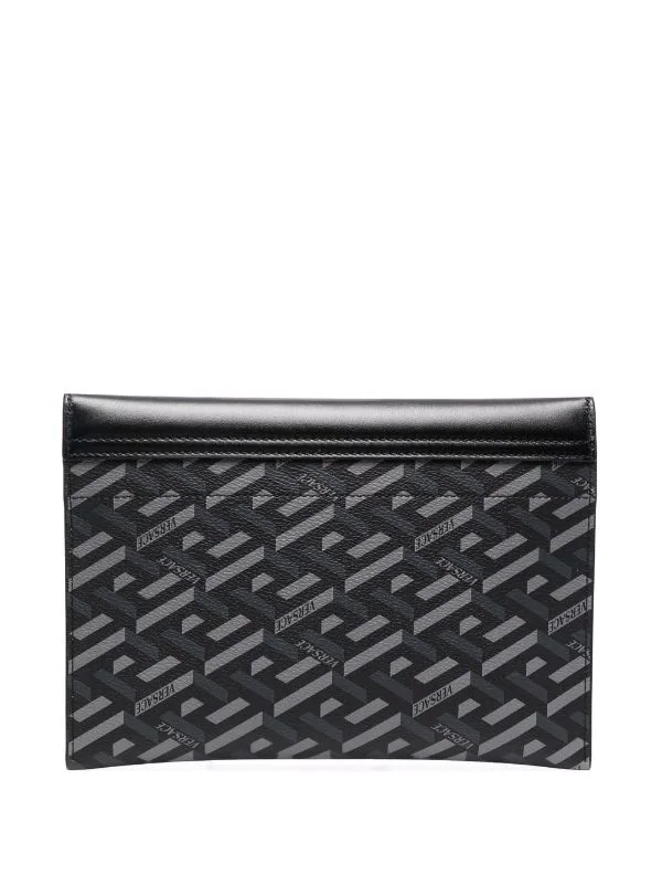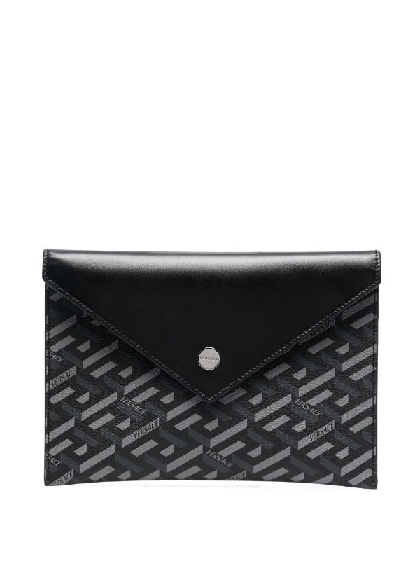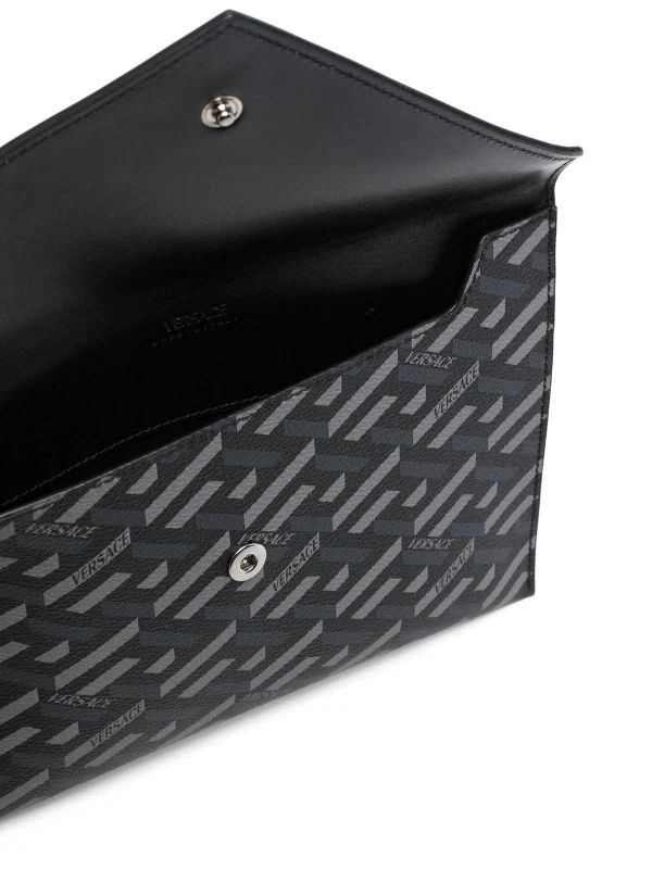 Finitions en métal argenté, imprimé La Greca signature, rabat sur le dessus à boutons pression, compartiment principal. Couleur : noir.