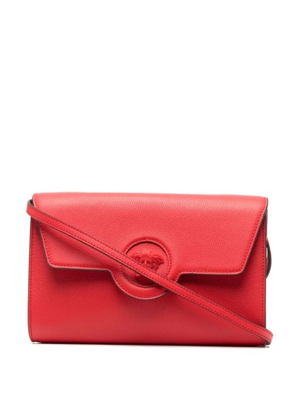 Texture grainée, motif Medusa, logo embossé, bride porté épaule détachable et ajustable, rabat sur le dessus à fermeture magnétique, compartiment principal, poches intérieures zippées, compartiments intérieurs pour carte. Couleur : rouge. Matière : cuir.