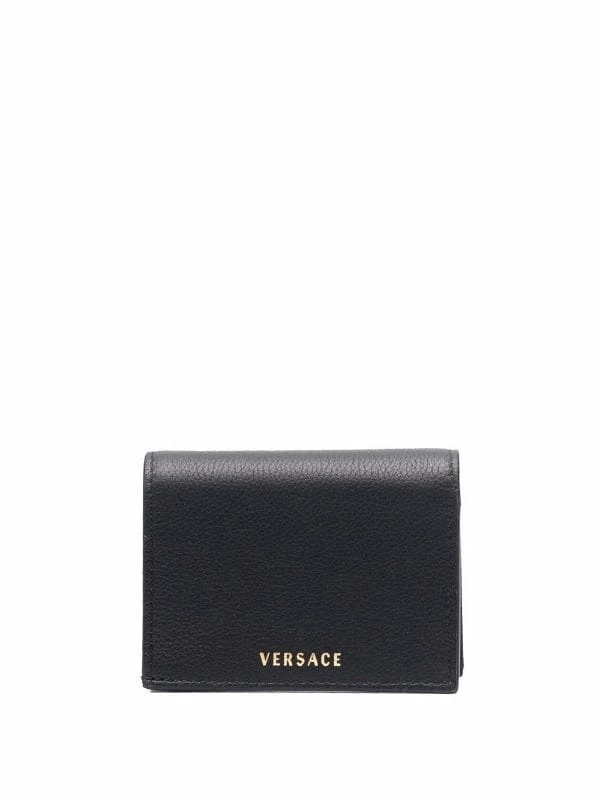 Détail Medusa, logo doré, fermeture à boutons pression, compartiments intérieurs pour carte. Couleur : noir. Matière : cuir.