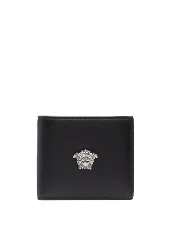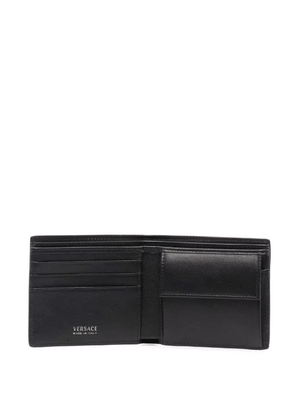 Détail Medusa, fentes pour carte, compartiment à billets, poche ticket. Couleur : noir. Matière : cuir de veau.