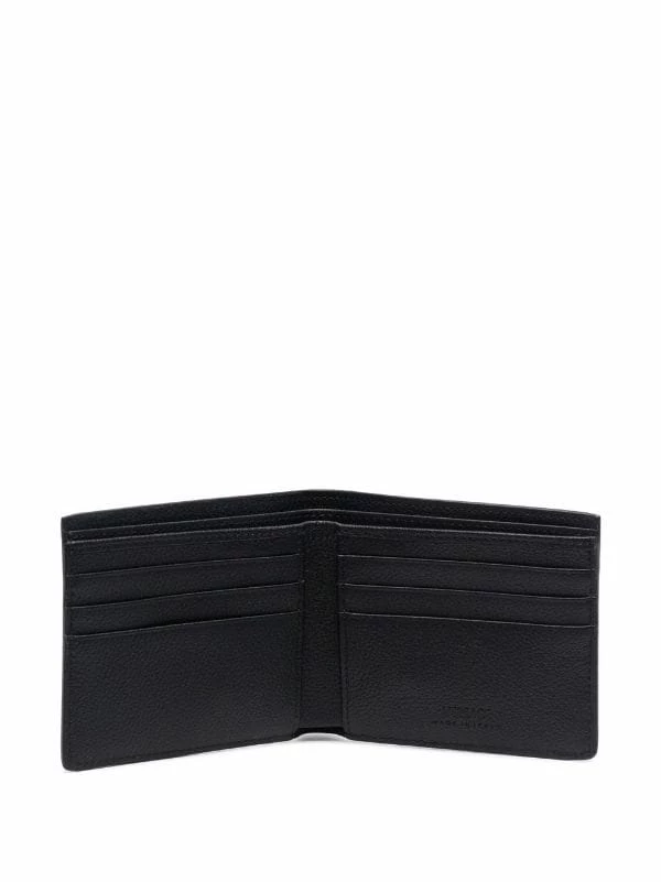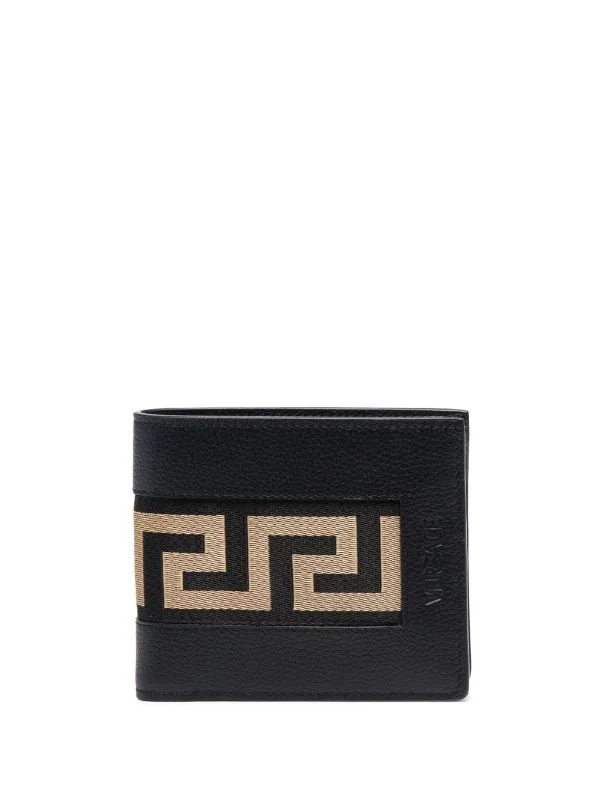 Détail Greca signature, design pliant, fentes pour carte, compartiment à billets intérieur.
