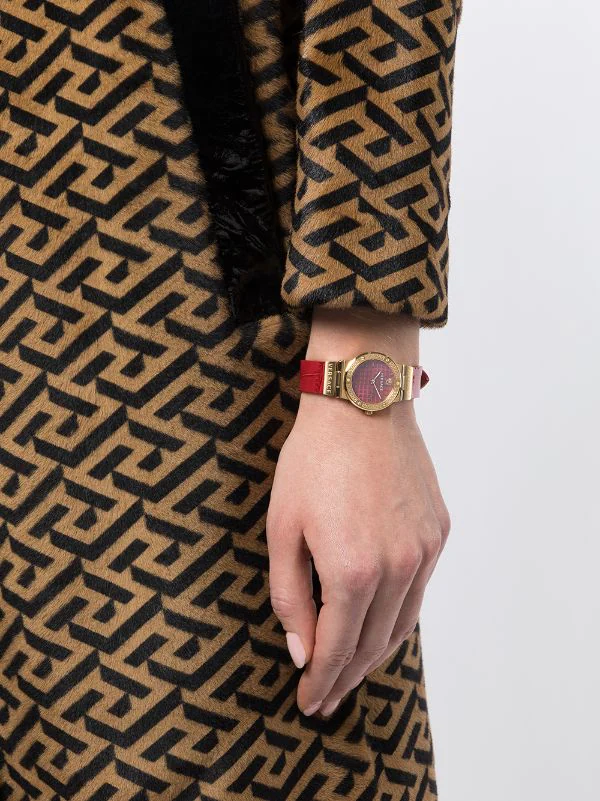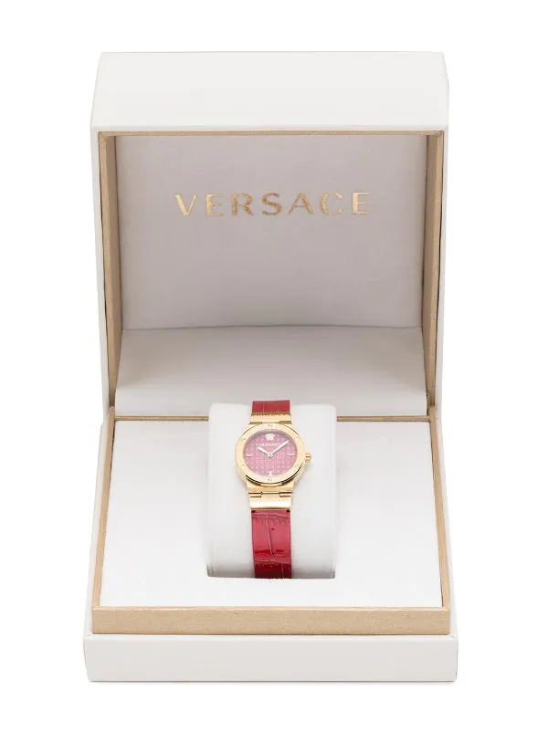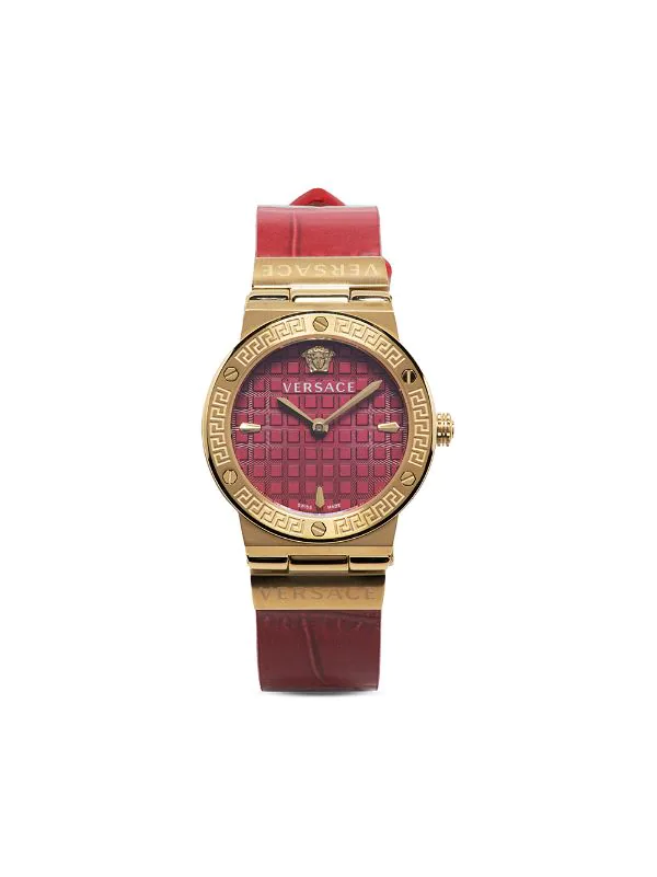 Boîtier rond, détail Greca signature, motif Medusa, mouvement à quartz, bracelet en cuir de veau, fermoir à trou, aiguilles index, couronne vissée. Couleur : rouge. Cet article bénéficie de deux ans de garantie standard proposés par la marque.