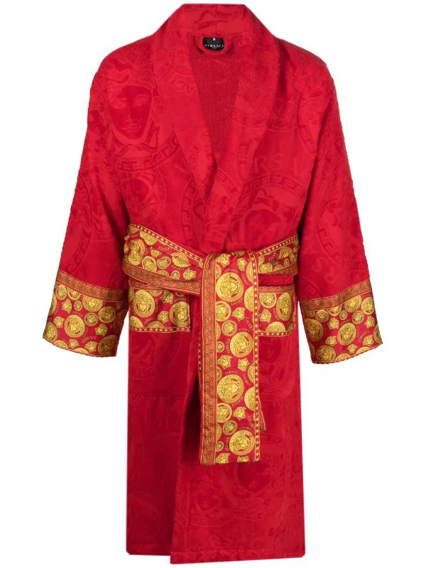Motif Medusa, logo embossé, col châle, taille nouée, manches longues, deux poches latérales plaquées. Matière : coton.
