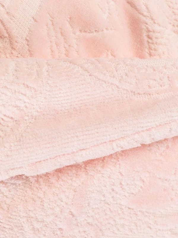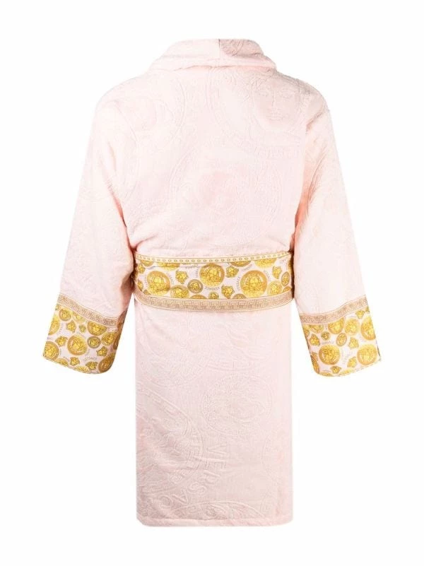 Motif Medusa, col châle, manches longues, bordure contrastante, motif baroque, taille nouée. Couleur : rose. Matière : coton.