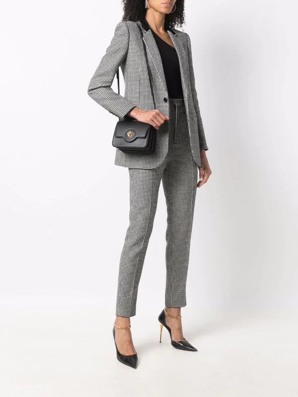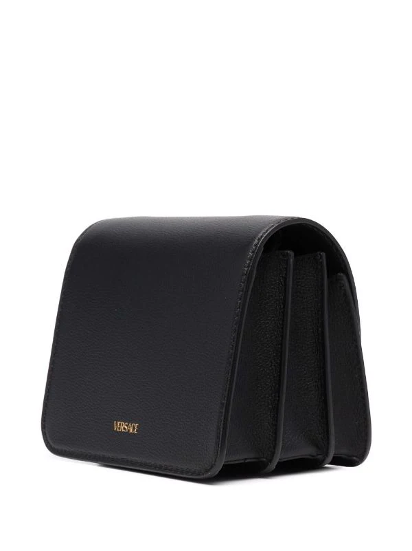Détail Medusa, compartiment intérieur, poche intérieure zippée, rabat sur le dessus à fermeture magnétique, bretelle portée épaule unique. Couleur : noir. Matière : cuir de veau.
