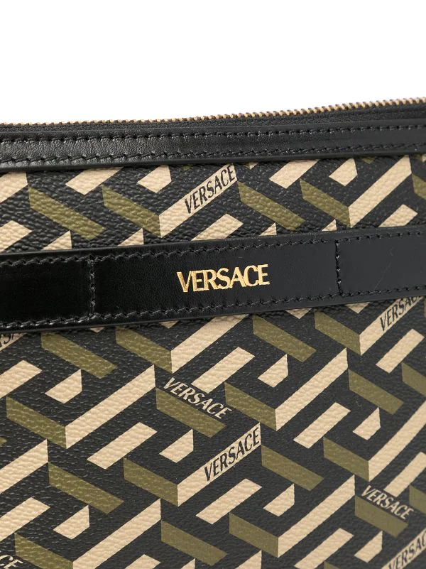 Imprimé La Greca signature, finitions en métal doré, logo doré, fermeture zippée sur le dessus, bride porté épaule détachable. Matière : cuir.