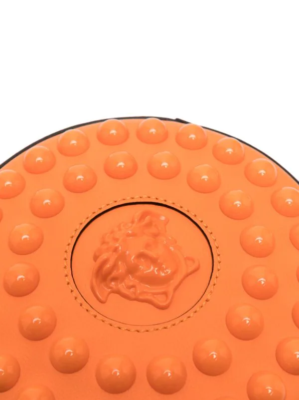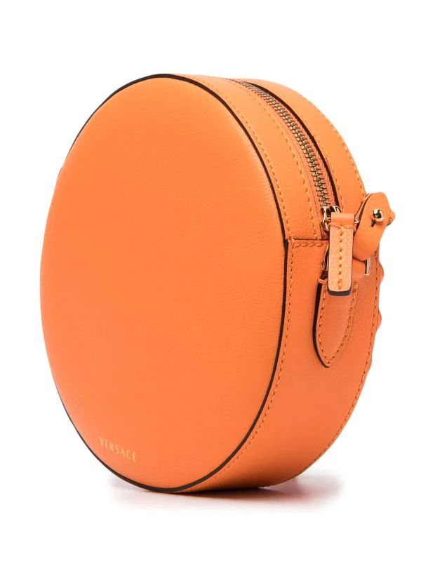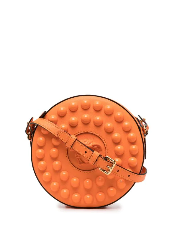 Détails de perles brodées, forme arrondie, motif Medusa, fermeture zippée sur le dessus, bride porté épaule ajustable. Couleur : orange. Matière : cuir.