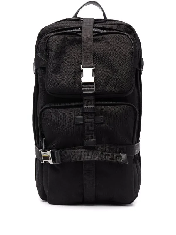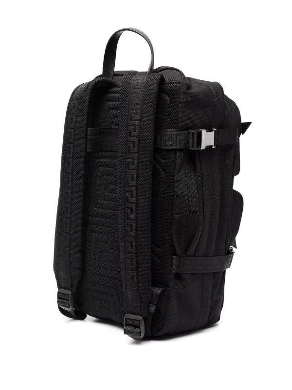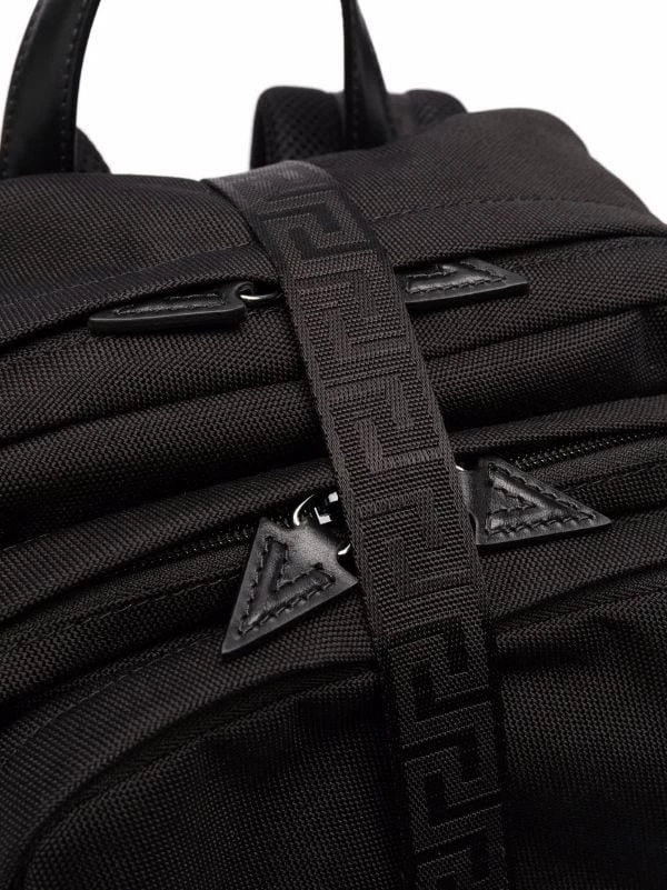 Détail Greca signature, brides porté épaule ajustables, anse classique, fermeture zippée tout autour, bretelles à boucle, poches à fermeture zippée devant. Couleur : noir.