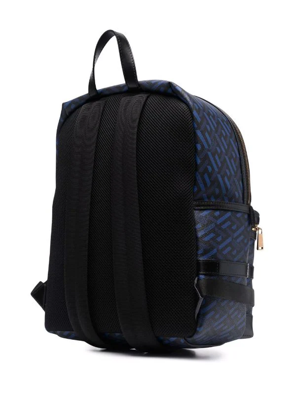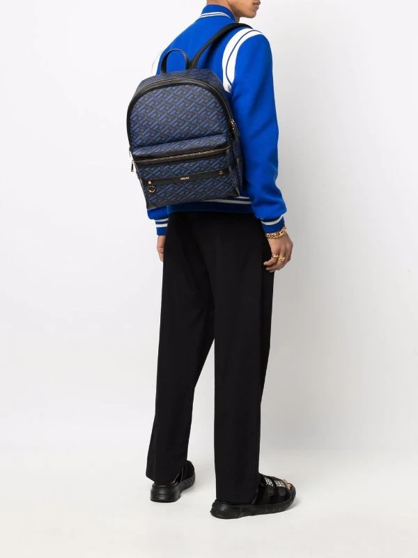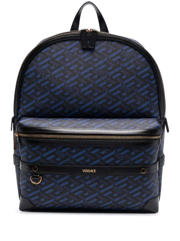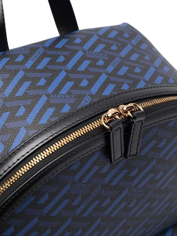 Motif Greca signature imprimé, logo imprimé sur le devant, liseré en cuir, finitions en métal doré, compartiment principal, compartiment zippé sur le devant, anse classique, brides porté épaule ajustables. Matière : cuir.