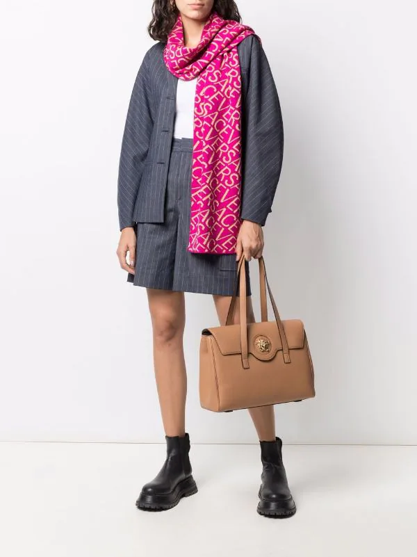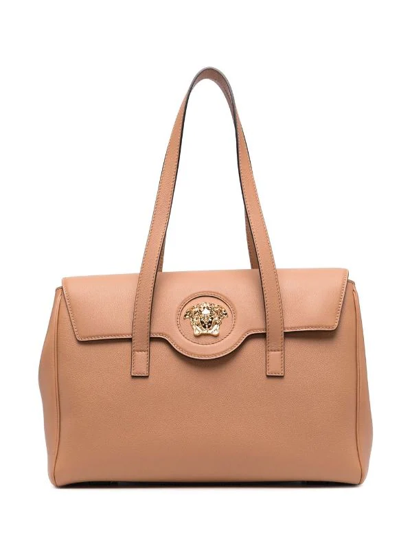 Détail Medusa, logo embossé, deux longues anses sur le dessus, rabat sur le devant, fermeture magnétique, poches intérieures zippées. Couleur : marron.
