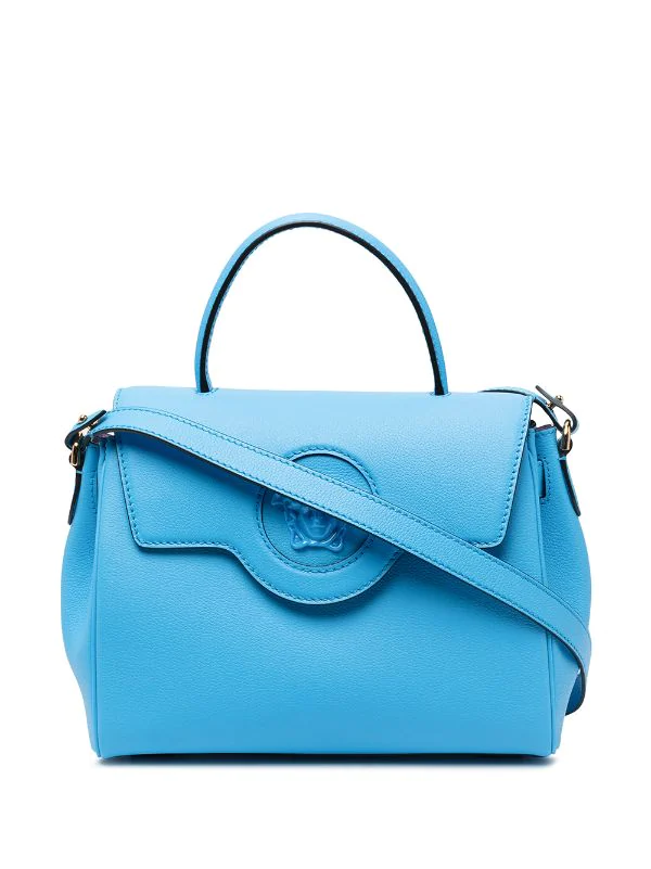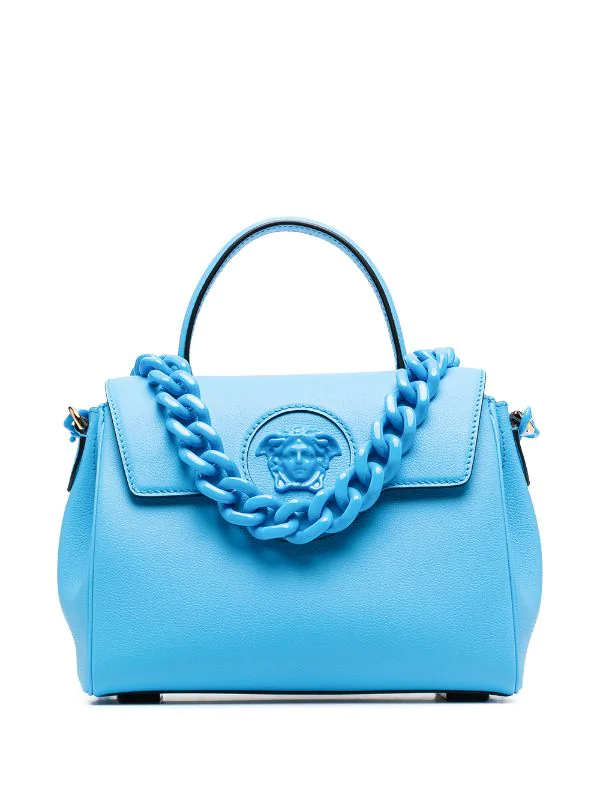Fini mat, anse arrondie, bride portée épaule en chaîne, bride portée épaule ajustable, logo imprimé à l’arrière, rabat sur le dessus à fermeture magnétique, poche intérieure zippée. Couleur : Bleu. Matière : cuir.