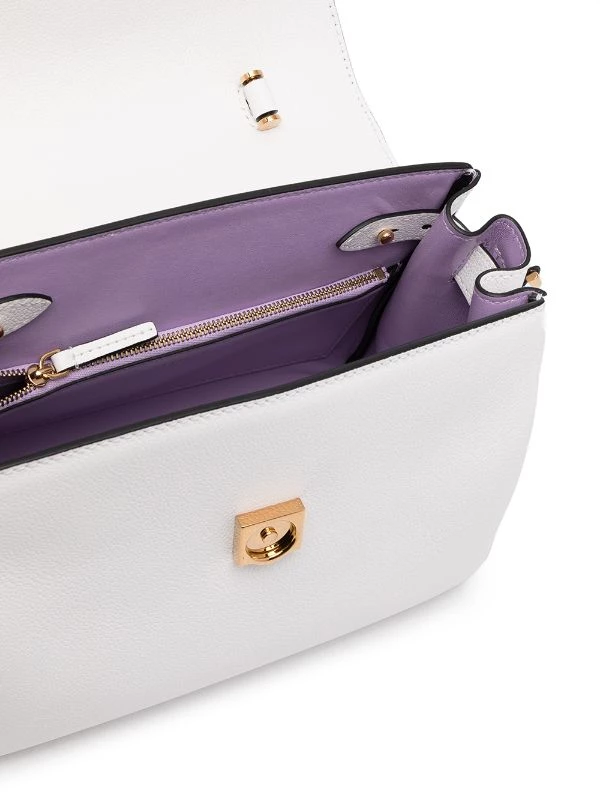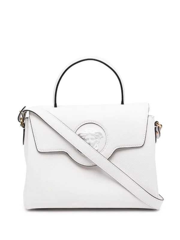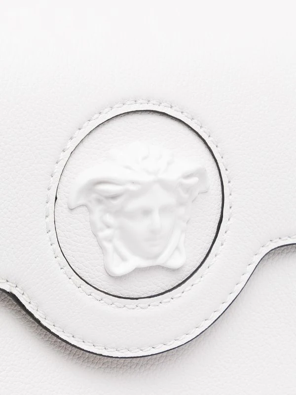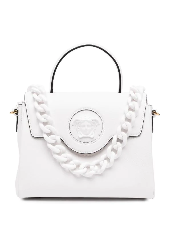 Motif Medusa, détails de chaînes, design ton sur ton, rabat sur le dessus à fermeture magnétique, compartiment principal, anse arrondie, bride porté épaule détachable. Couleur : blanc. Matière : cuir.