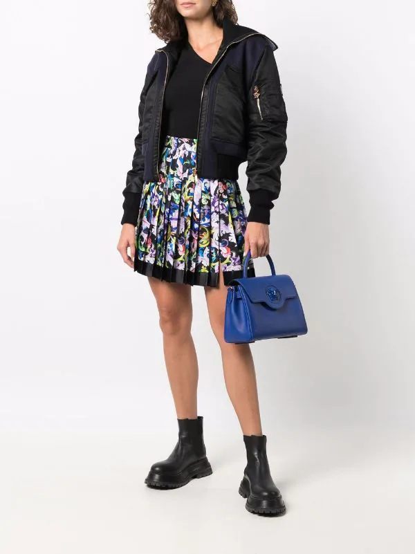 Motif Medusa, bride porté épaule en chaîne détachable, bride porté épaule détachable et ajustable, design ton sur ton, rabat sur le dessus à fermeture magnétique, compartiment principal, anse arrondie. Couleur : bleu. Matière : cuir de veau.