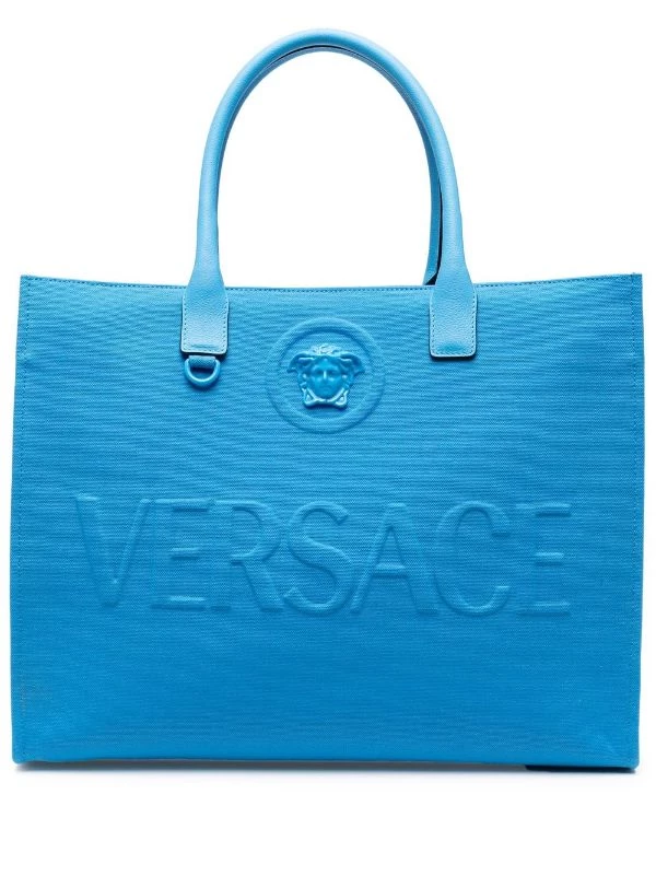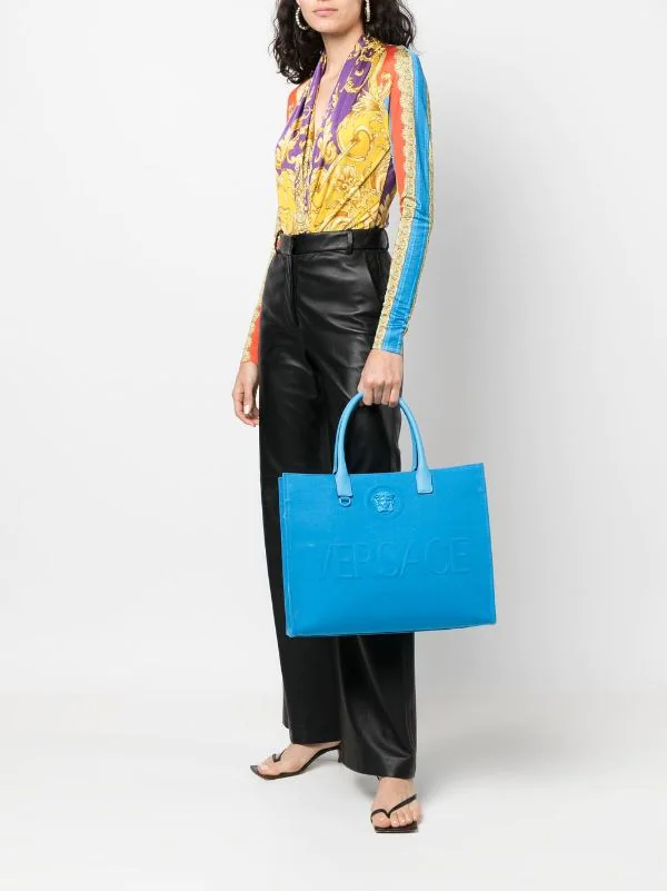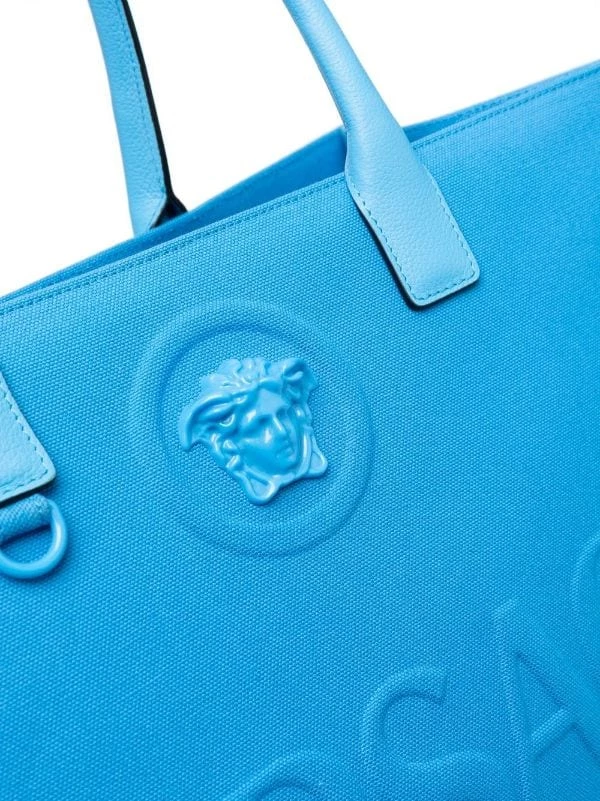 Détail Medusa, logo embossé sur le devant, anses arrondies, compartiment principal. Matière : coton.