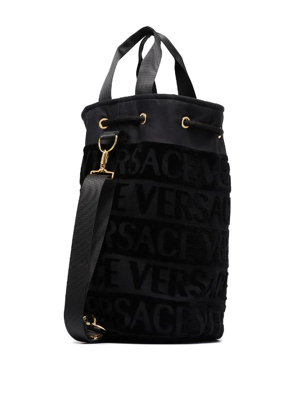 Imprimé monogrammé, fermeture à lien de resserrage, finitions en métal doré, bride porté épaule détachable, anses arrondies. Couleur : noir. Matière : coton.