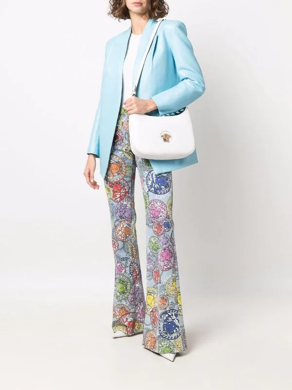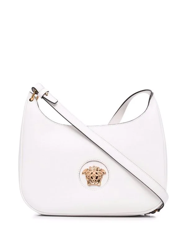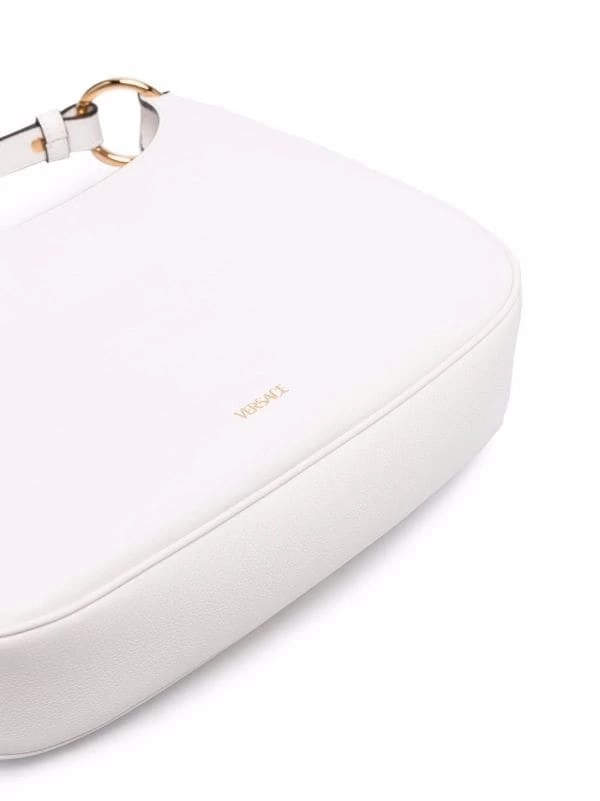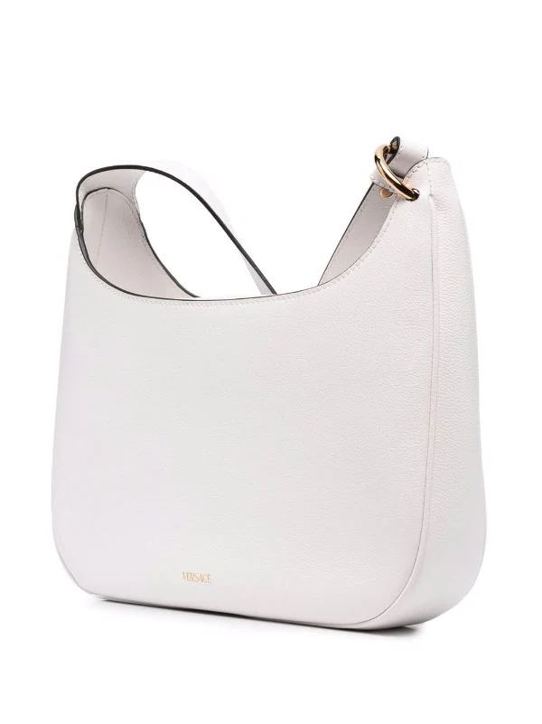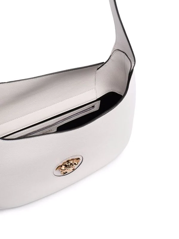 Détail Medusa, fermeture zippée sur le dessus, poches intérieures zippées, bretelle portée épaule unique. Couleur : blanc.