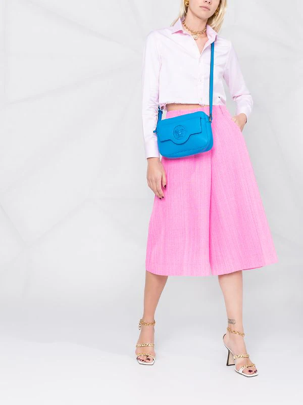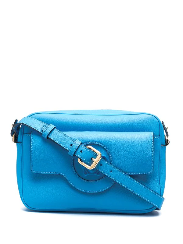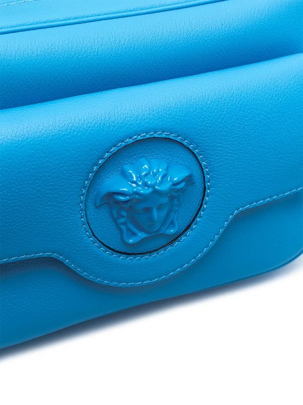 Fermeture zippée sur le dessus, bretelle fine, motif Medusa. Couleur : Bleu. Matière : cuir.