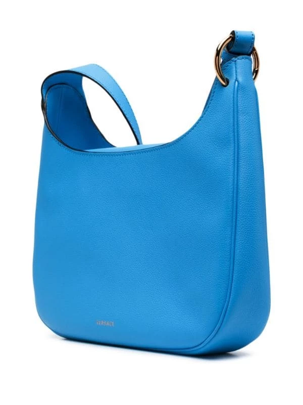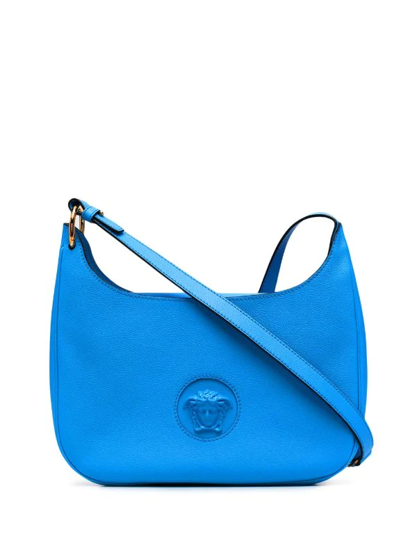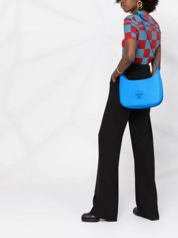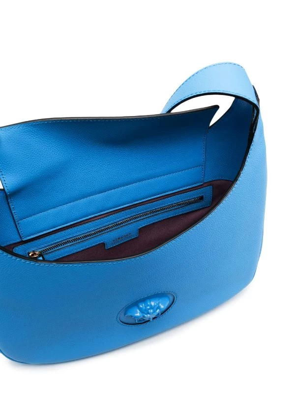 Motif Medusa, bride porté épaule détachable, poche intérieure zippée. Couleur : bleu.