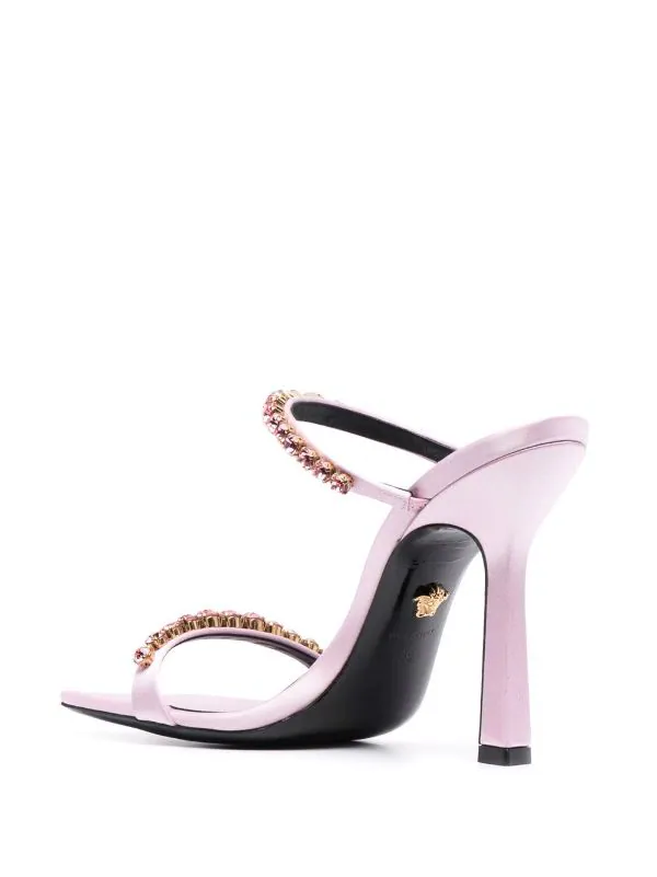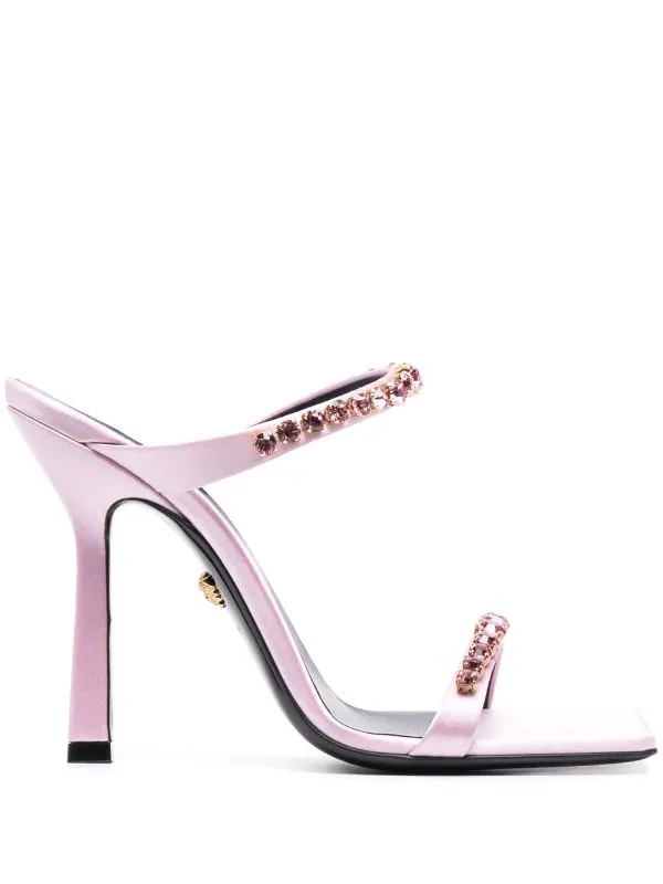 Talon haut, bout ouvert, ornement en cristal, design double-tour, bout carré. Couleur : rose. Matière : cuir.