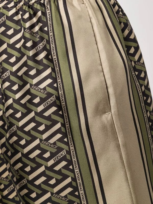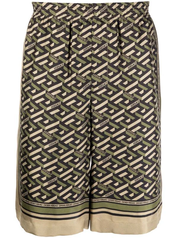 Ceinture élastique, motif Greca signature imprimé, deux poches latérales fendues, hauteur genou, poche arrière passepoilée. Matière : soie.