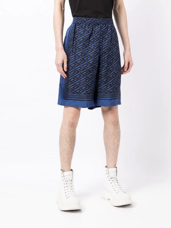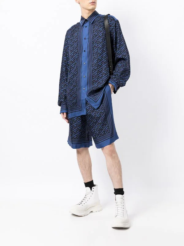 Bleu marine, soie, motif Greca signature imprimé, ceinture élastique, à enfiler, deux poches latérales fendues.