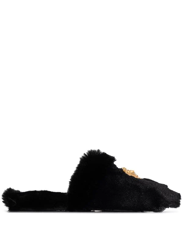 Slippers à plaque Medusa Versace avec plaque logo, petit talon et design texturé. Couleur: noir.