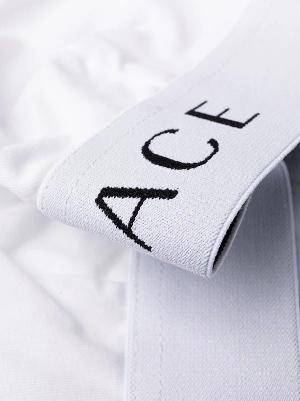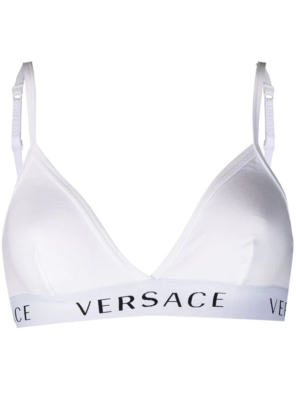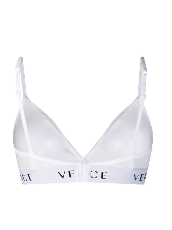 Bonnets triangles, bande à logo, brides portées épaules ajustables, fermeture à œillets et agrafes au dos. Couleur : blanc. Les sous-vêtements et les articles de lingerie doivent être essayés par-dessus vos vêtements ; nous comptons sur vous.
