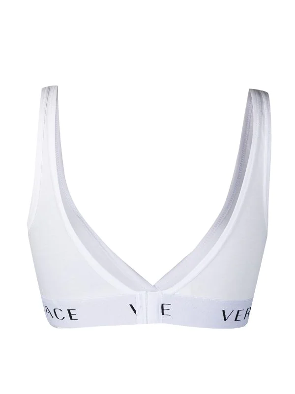Bonnets triangles, bande à logo, fermeture à œillets et agrafes au dos. Couleur : blanc. Les sous-vêtements et les articles de lingerie doivent être essayés par-dessus vos vêtements ; nous comptons sur vous.
