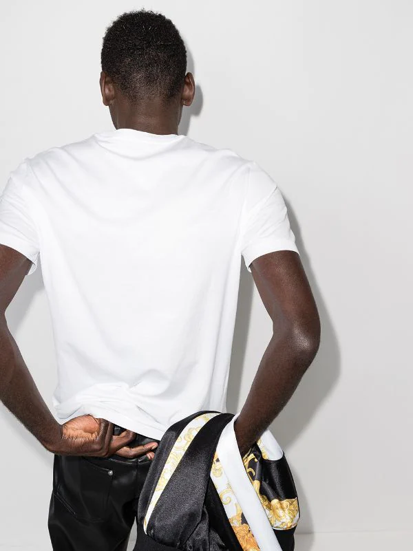 Encolure ronde, imprimé graphique sur le buste, tricot point jersey, ourlet droit, manches courtes. Couleur : blanc. Matière : coton.