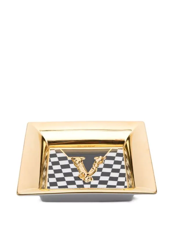 Effet métallisé, motif damier, logo lettre, forme carrée. Matière : céramique.