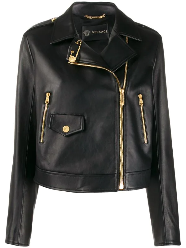 Veste de moto crop en cuir d’agneau Versace avec fermeture zippée en biais, a Medusa head logo embellishment, longueur crop, manches longues, doublure monogrammée, détails dorés, poches devant zippées et ourlet droit. Couleur : noir.