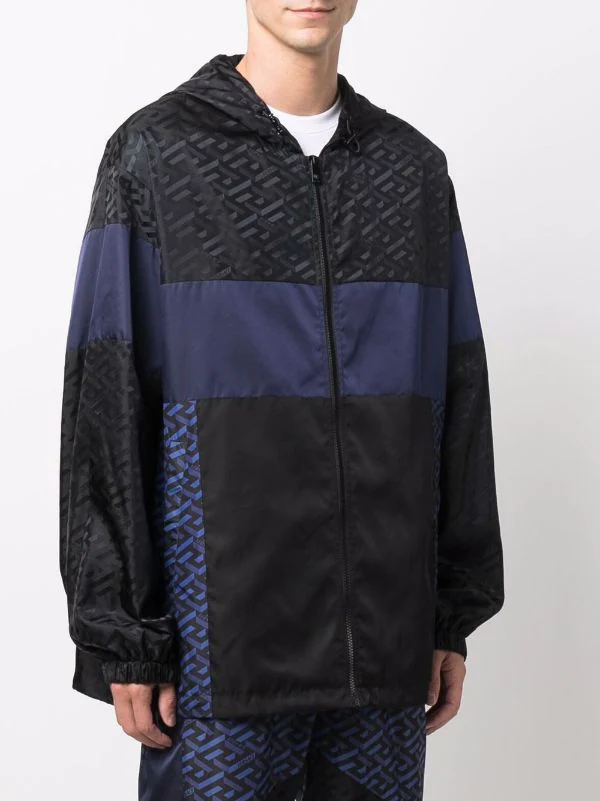 Imprimé monogrammé, logo lettre, design à empiècements, capuche à lien de resserrage, poignets élastiqués, deux poches latérales fendues, fermeture zippée devant.