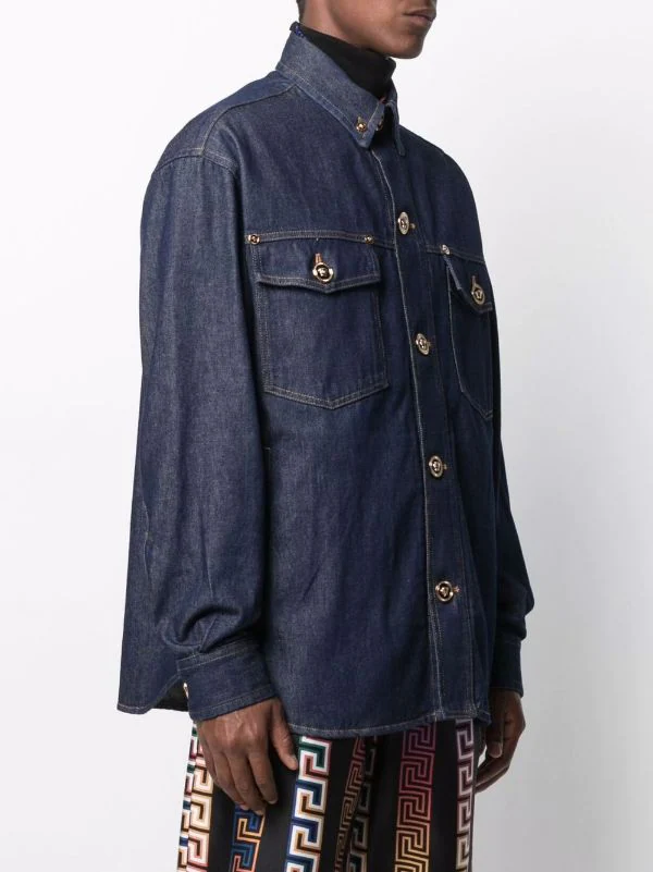 Coutures contrastantes, col boutonné, boutonnière sur le devant, manches longues, poignets boutonnés, deux poches poitrine à rabat, ourlet incurvé. Matière : denim de coton.