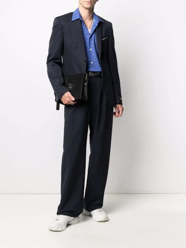 Revers crantés, boutonnière sur le devant, épaulettes, manches longues, poignets boutonnés, détails de chaînes, poche passepoilée sur la poitrine, deux poches latérales à rabat, double fente arrière. Couleur : bleu. Matière : laine vierge.